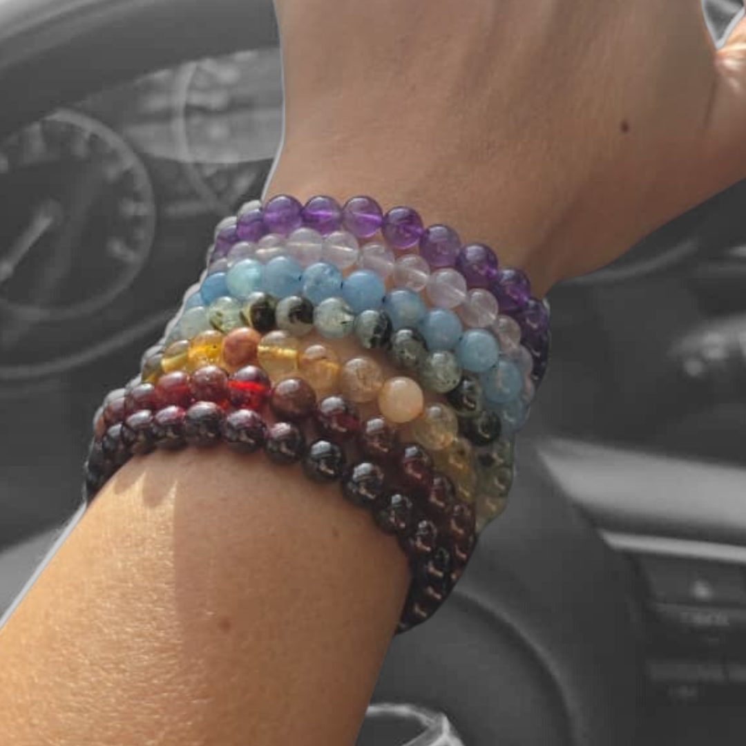 7 Pulseras con una vibración excepcional: Granate Rojo, Granate Naranja, Rutilos, Prenhita, Aguamarina Extra, Piedra de Luna Extra y Aguamarina Extra.