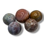 El jaspe océano es una variedad de calcedonia volcánica con inclusiones de diferentes minerales, lo que le otorga un patrón visual único de círculos, ondas y paisajes marinos. Esta estructura resuena con el plexo solar y el chakra sacro, facilitando la expresión emocional, la confianza y la motivación. En forma de esfera, su energía se irradia de manera pareja, llenando el entorno de ligereza y dinamismo interior.