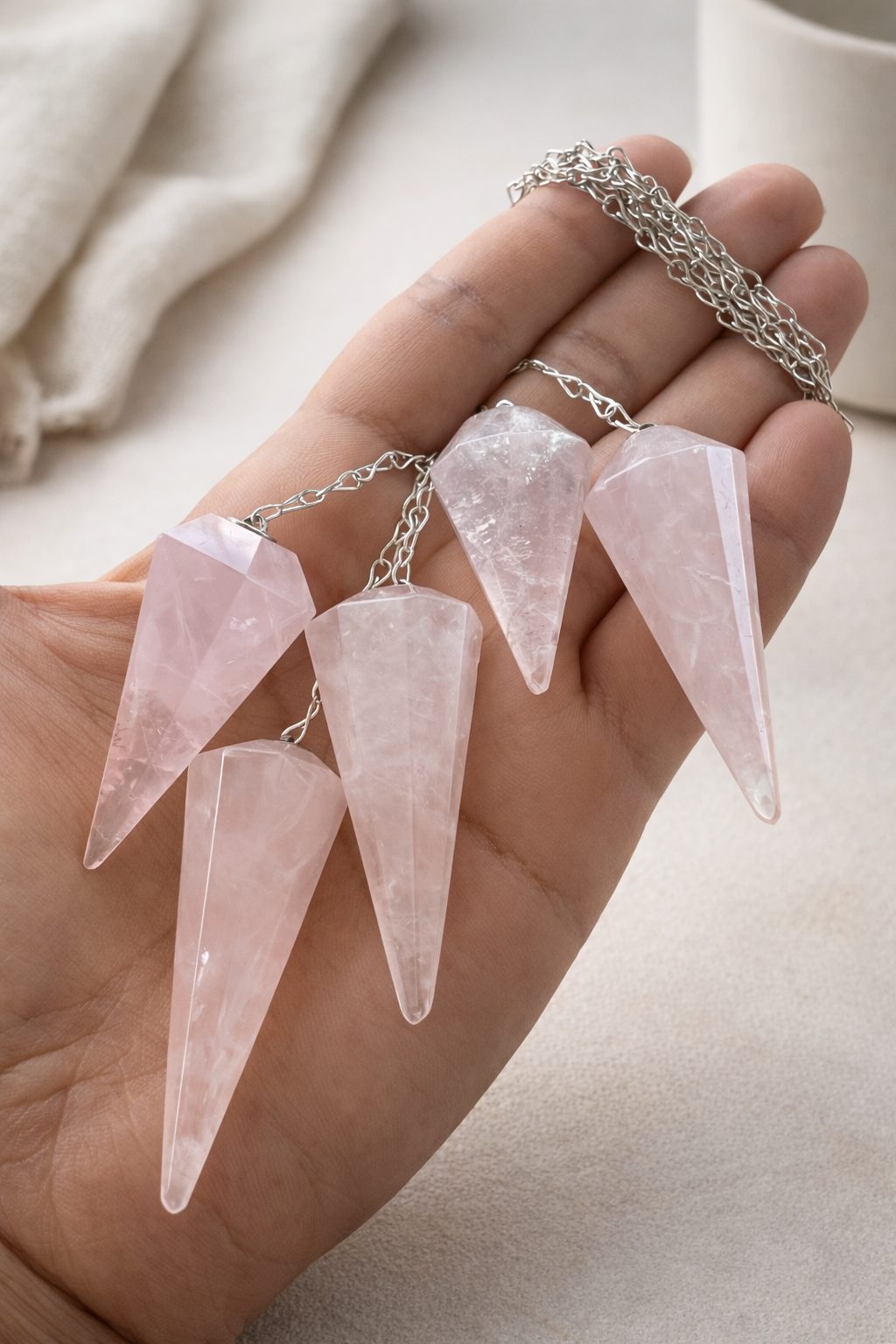 El cuarzo rosa es una variedad de cuarzo apreciada por sus tonalidades rosadas, que pueden ir desde matices muy suaves y lechosos hasta rosas más definidos. Su aspecto transmite calma visual, delicadeza y equilibrio. Cada pieza presenta diferencias naturales en color, transparencia y velos internos, por lo que cada péndulo conserva una identidad propia. Esa suavidad estética, unida a la solidez del cuarzo, hace que sea una pieza muy valorada tanto por su belleza como por su simbolismo.